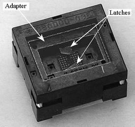 When the cover of the socket is depressed the contacts open and the latches move to the side. The package is dropped into the socket and is aligned by the sides of the adapter. When the cover is closed the latches guide the package and ensure that it is positioned correctly so that the contacts close on the balls.